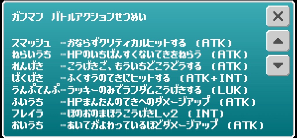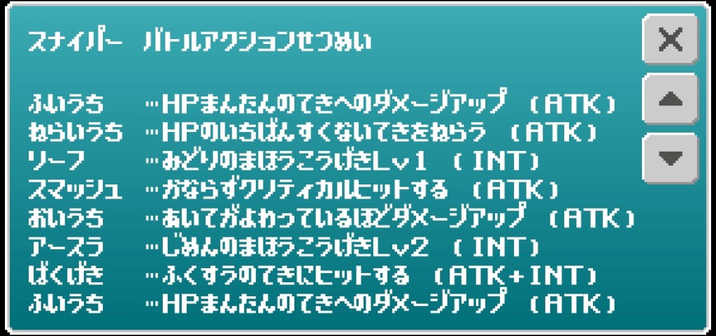 解説⑴→H2 A4 I4 S2 L3で成長。武器ボーナスは遠隔65%とかなり高い。ガンマンより技がATKとINTに絞られている点が使いやすい。
