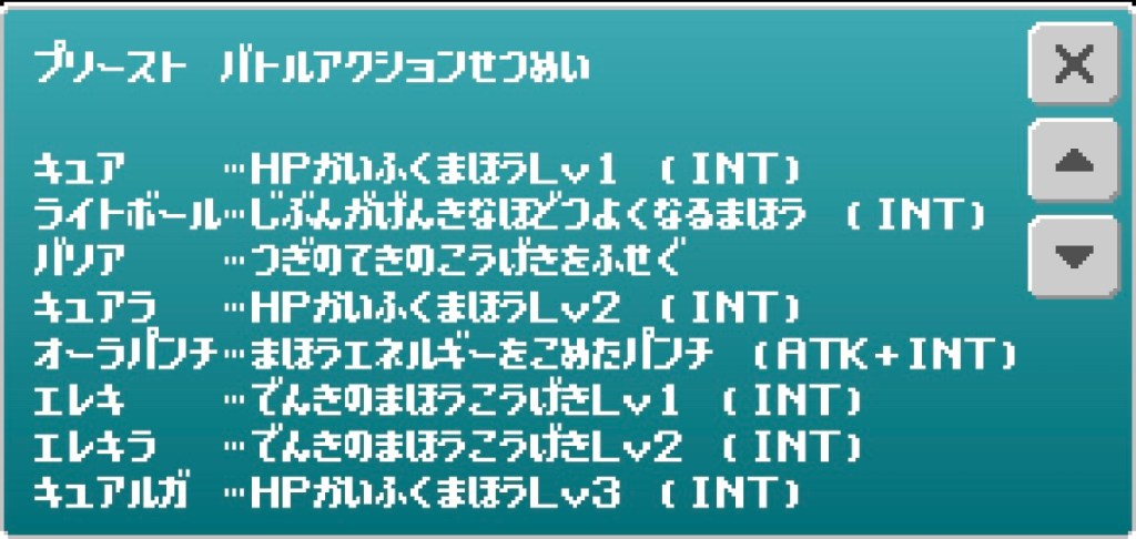 解説⑵→「神の祝福」。レベルアップ時に最大HPの25%回復する。戦士ジョブ並の耐久力を得る。序盤何も出来ないのに死なない不思議なやつ。